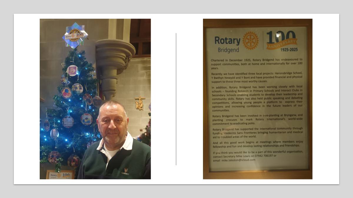 Our tree was decorated with Rotary symbols and images of Rotary Bridgend including our centenary projects, good causes supported and social activities.