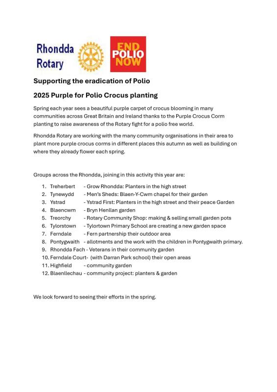 Towards the end of last year, Rhondda Rotary purchased 4000 Crocus Corms for planting throughout the Rhondda.