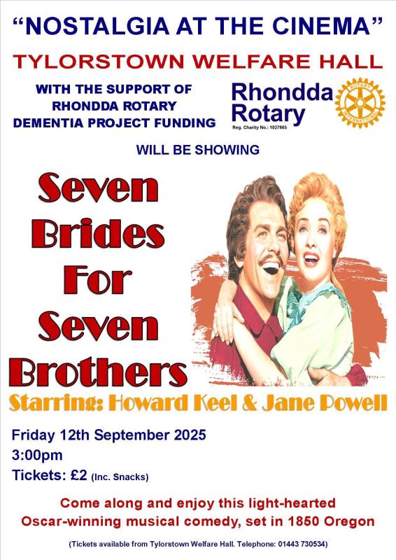 After the success of the first cinema event held back in November 2024, showing South Pacific, Tylorstown Welfare Hall with support from Rhondda Rotary Dementia Project, will be holding another event on 12th September 2025.