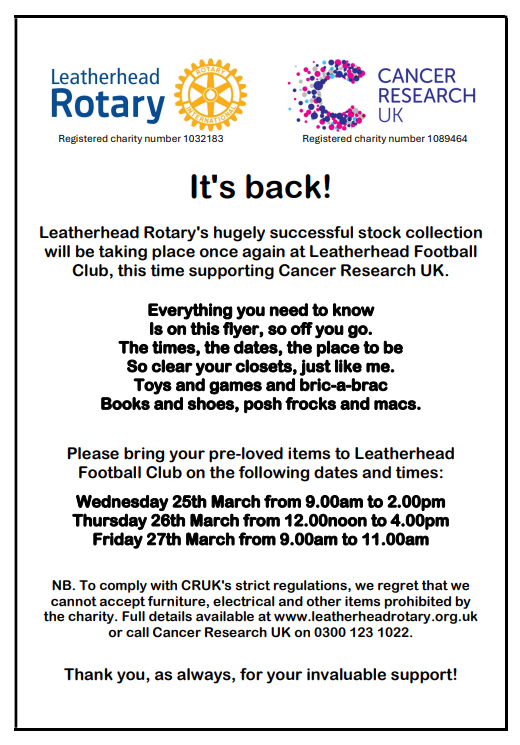 moreLeatherhead Rotary raises around £20,000 each year for a wide range of local, national and international charities.