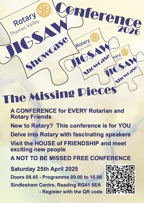 Sat 25th April At Sindlesham Court (as was the Centennial Dinner in 2024). A showcase that will emphasise the Projects and programmes not covered at last year's Jigsaw and is aimed at the newer Rotarians.
