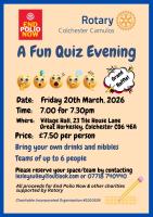 RC Colchester Camulos 7.00 for 7.30pm Great Horkesley Village Hall CO6 4EA Tickets £7.50 each. Proceeds to End Polio Now & other charities supported by Rotary. Details on poster. If you can't raise a team the organiser will place you in a team. Advance tickets only.