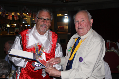 This was the first St.George's Day celebration that we held but we hope it will be the start of a new tradition. The event had been conceived, and brilliantly organised by President Elect Geoff. Many guests had taken the effort to find suitably coloured dresses and ties, but President Graham topped it all with an impressive St.George's outfit, complete with sword but without a helmet.