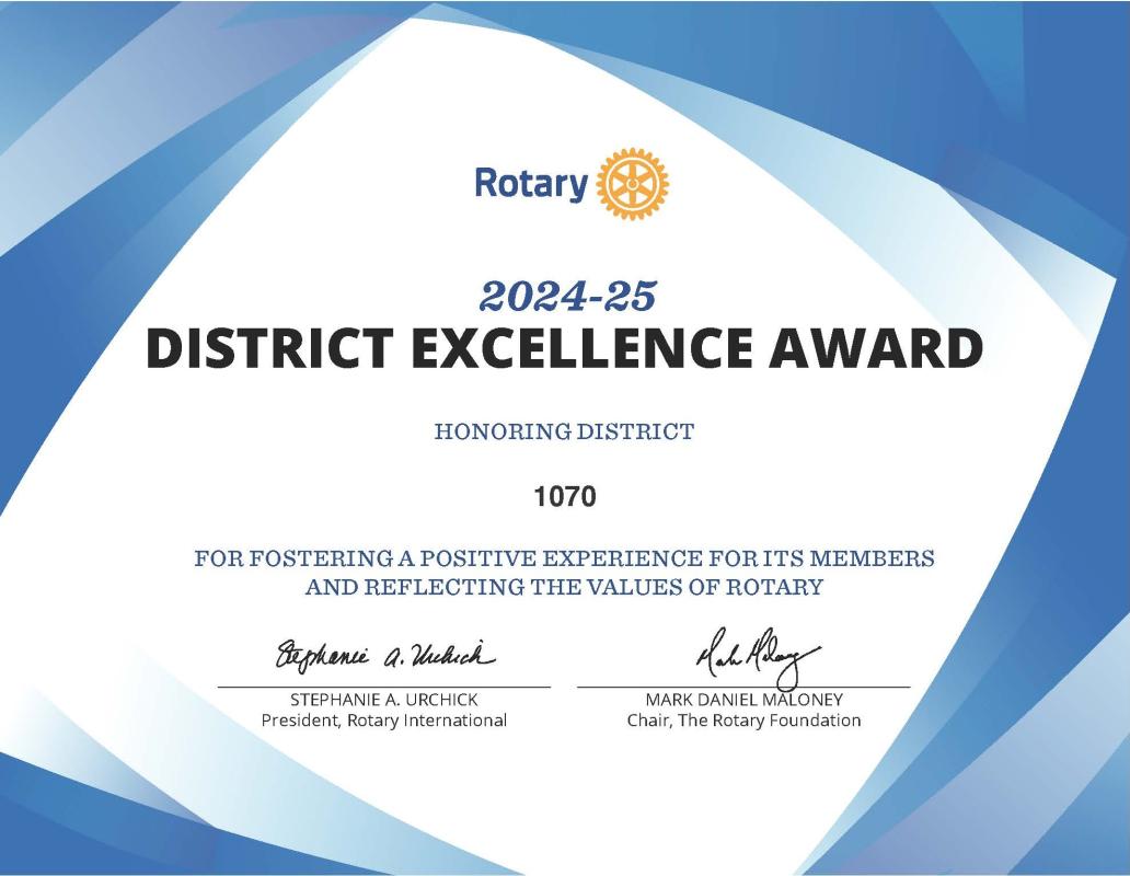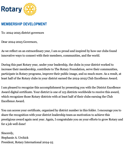 Chris Knight (District Governor 2024-25) would also like to thank David Kendrick for all the work he has put in to assisting clubs and the District to achieve this award.