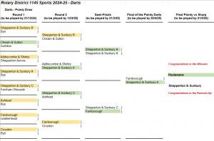 Teams of FOUR, at least THREE of whom must be Rotary members. Best of five games – 501, straight in, double out