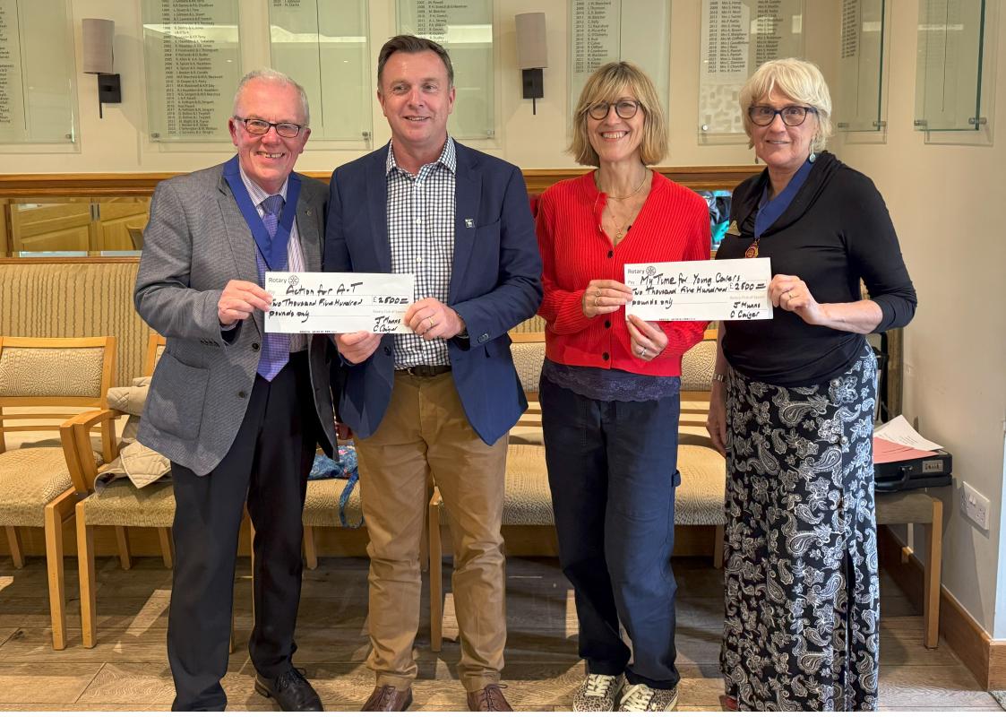 Sean Kelly (Action for AT-T and Cathy Wood (My Time for Young Carers) each were given a cheque for their respective charities today 5th June 2025. The money was raised by Epsom Rotary's Centenary Spring Ball which took place last month.
