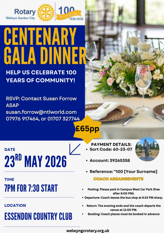 Rotarians and friends across District 1260 are invited to join Welwyn Garden City Rotary for a landmark celebration. We are marking 100 years of community service and charitable giving (1926–2026) with a spectacular gala dinner