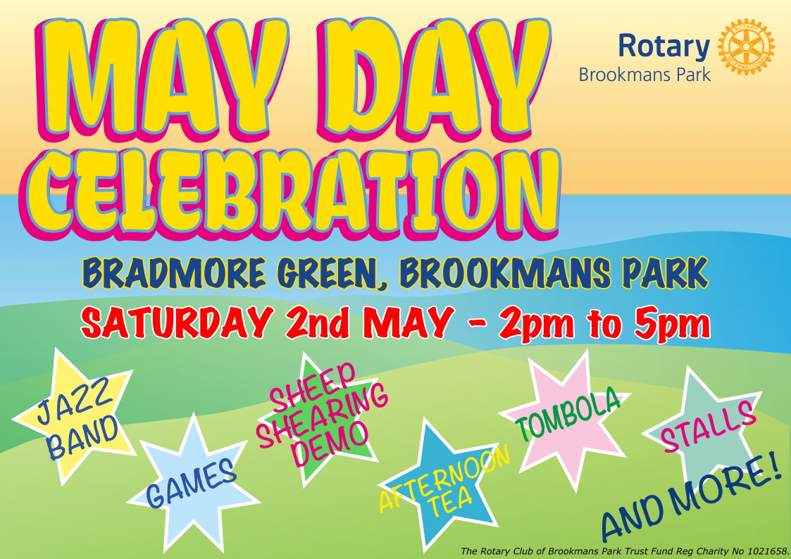 Brookmans Park Rotary is holding our annual May Day community event on Saturday, 2nd May 2026 in Bradmore Green, Brookmans Park AL9 7QT. The event is open to the public between 2pm to 5pm.