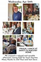 more We met at the David and Heather's home for a tasty frugal lunch and raise £100 for our charity account.