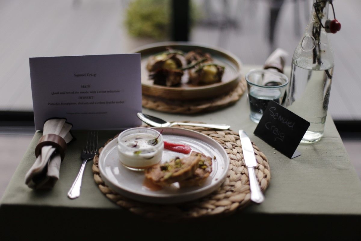 Samuel opted for a main course of quail with a stout soy reduction, serviced with Hen of the Woods mushroom and garlic mash. That was followed by pistachio and rhubarb frangipane, served with a crème fraiche sorbet for dessert.