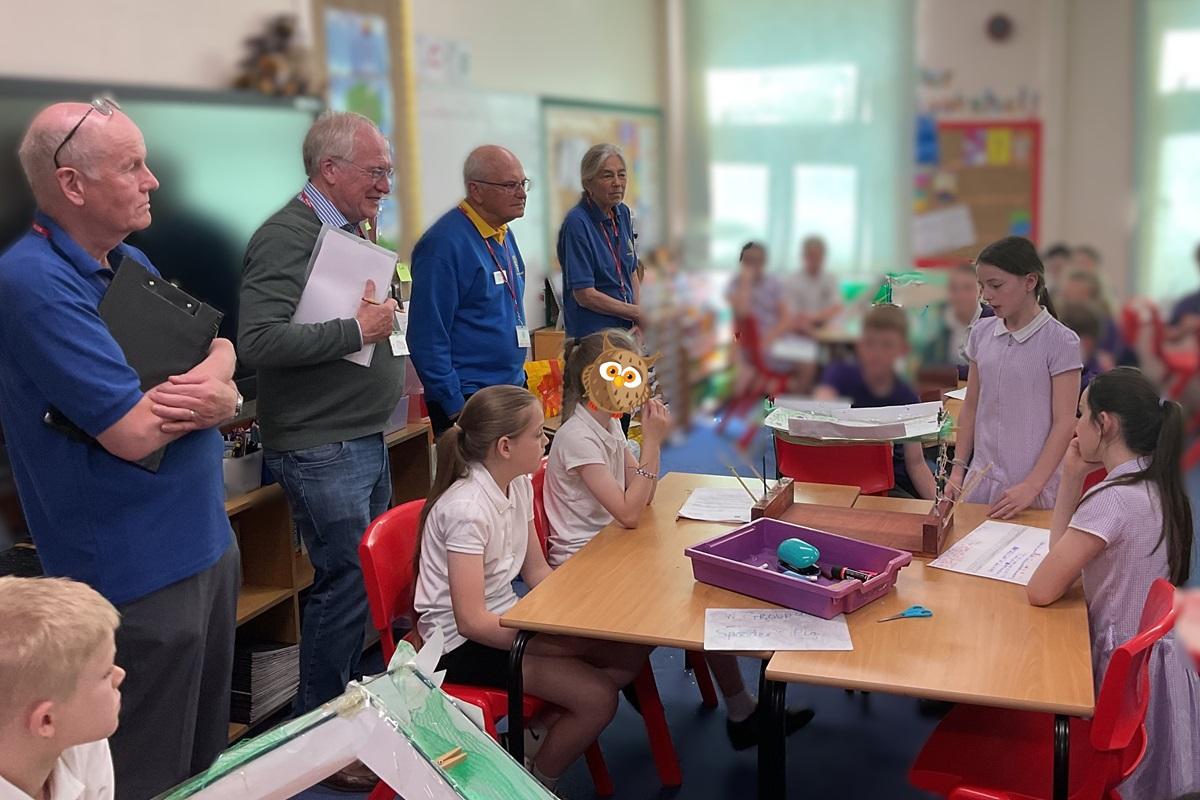 The children, working in teams of four, had to solve an interactive technology task and were required to design, model and build a solution with materials such as paper, card, clothes pegs, string and elastic rubber bands, using a premade wooden base, all supplied by Rotary free of charge.