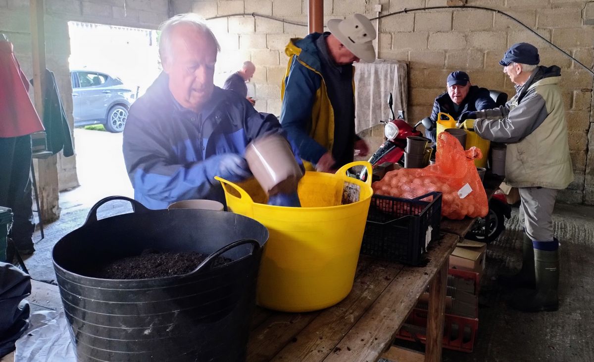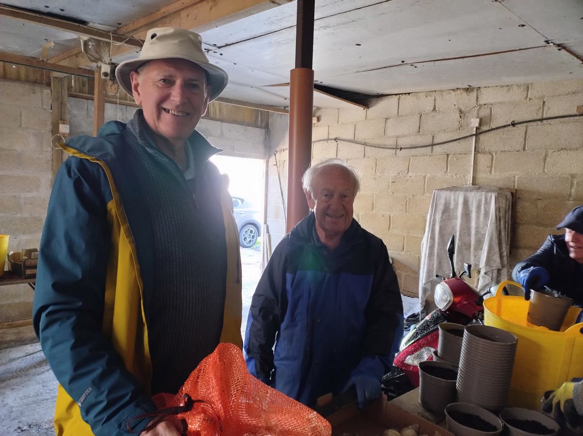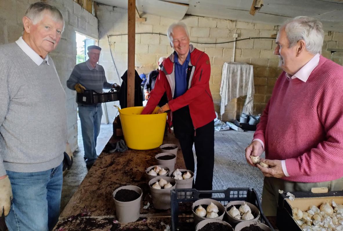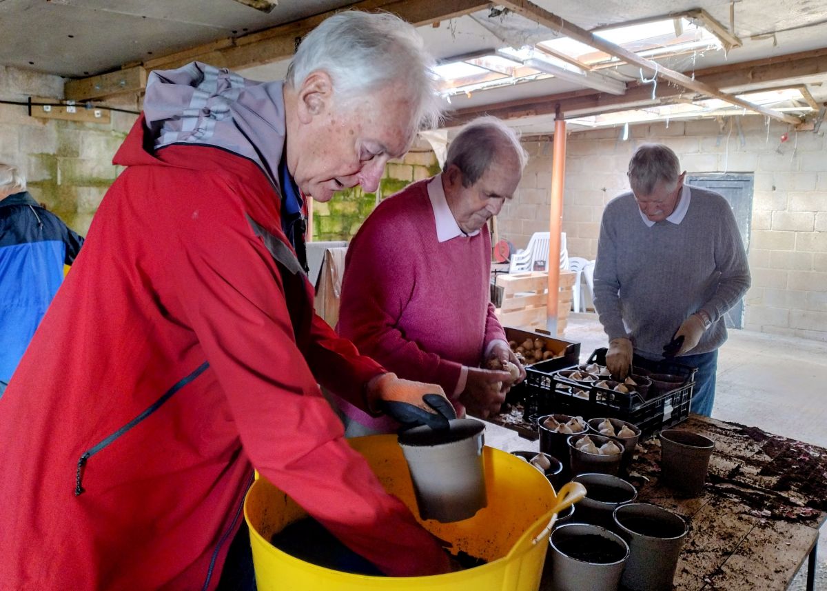 With only 104 days to Christmas about 1,900 pink, white and blue hyacinth bulbs were planted in their pots in readiness for selling in November and December. So, on Thursday of last week, 10 of our members spent a busy and enjoyable afternoon on the production line planting some 630 pots of the bulbs.