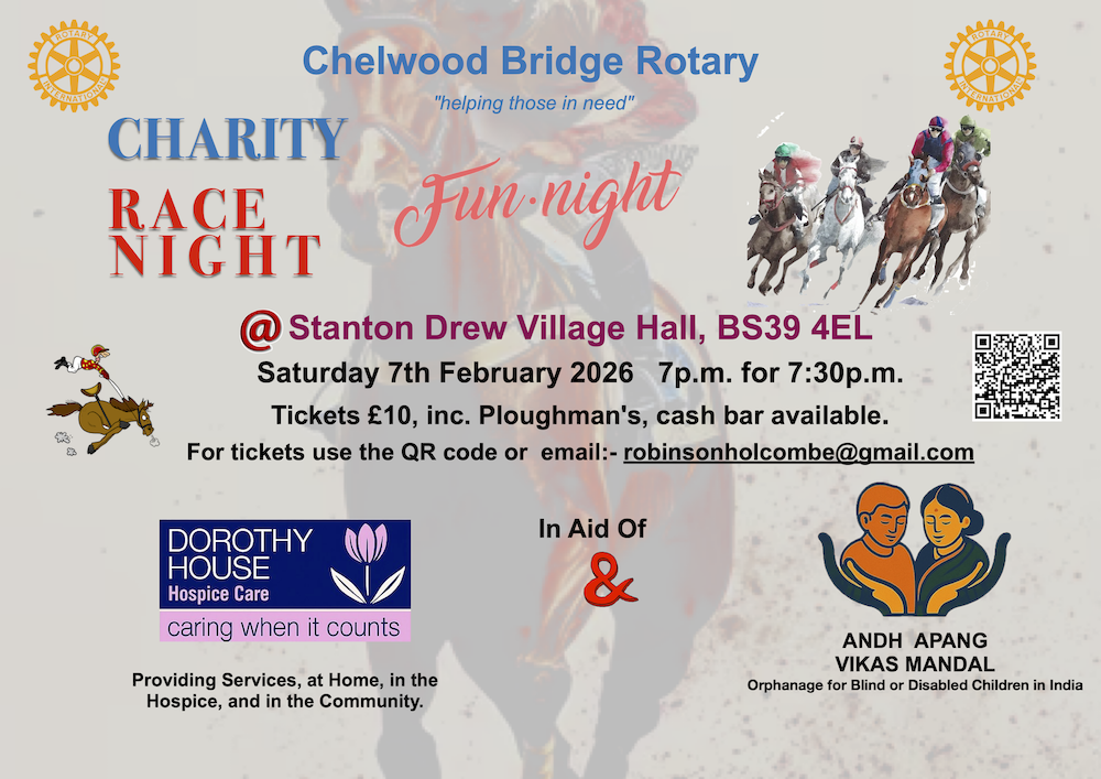 Chelwood Bridge Rotary is hosting a fun Race Night on Saturday 7 th February at Stanton Drew Village Hall, and we’d love to see you there. The evening will feature eight races shown on the big screen, giving you the chance to win cash prizes while enjoying a great night out, all while helping to raise vital funds for Rotary projects. Tickets are running out, so don’t miss out on what promises to be a lively and entertaining evening for a great cause. Get involved, support Rotary, and enjoy a fantastic night of racing.