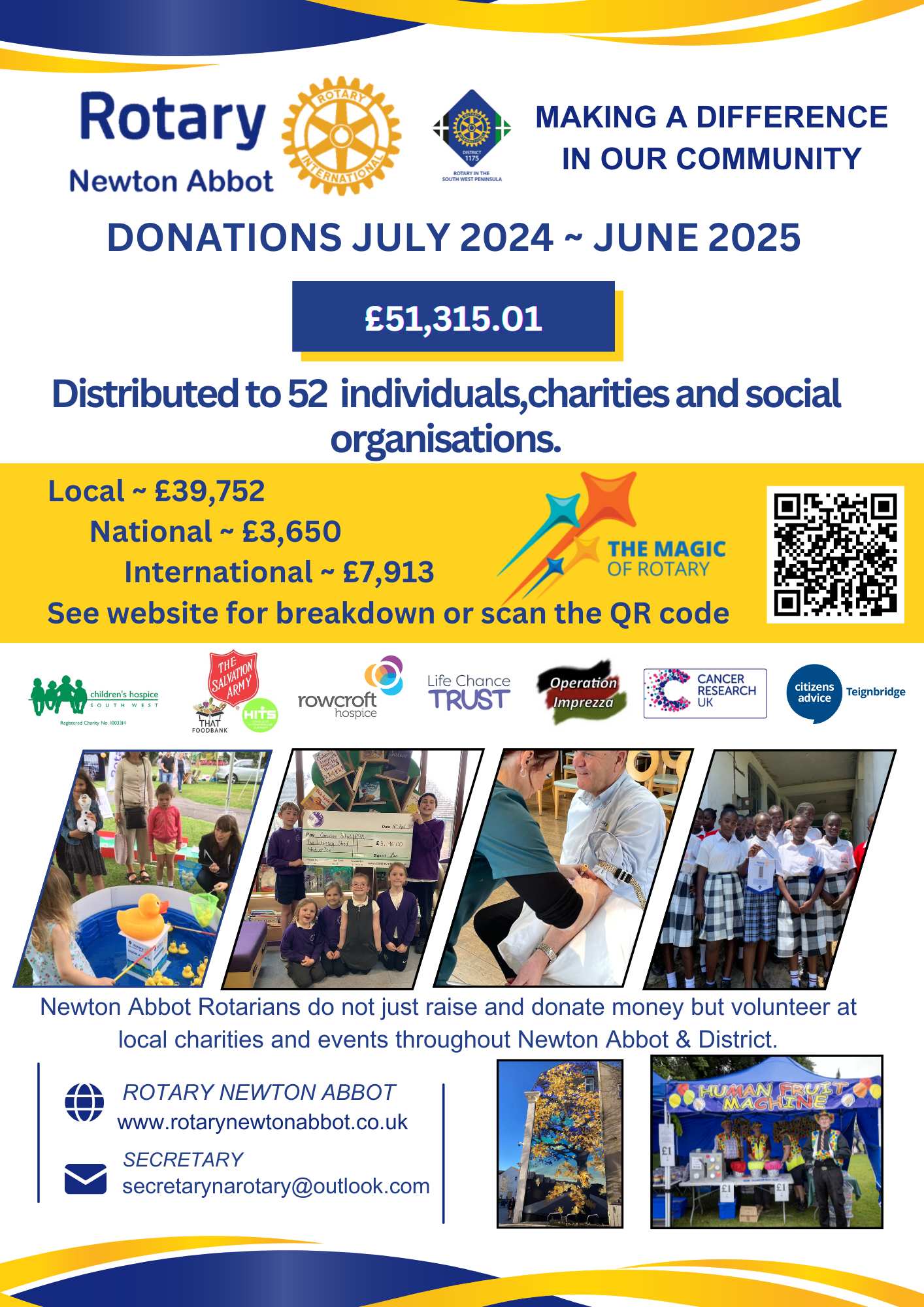 ROTARY Newton Abbot (RNA) founded in 1922 still has a thriving membership of over 100 men and women from a wide range of professions, businesses and organisations who all share a common interest in helping others. Each member enjoys business as well as social networking opportunities, whilst giving something back to those less fortunate, learning new skills and joining in on social evenings with partners.100 years of serving the local community, Rotary Newton Abbot has raised and donated many thousands of pounds, shared skills and knowledge to charities and social organisations.