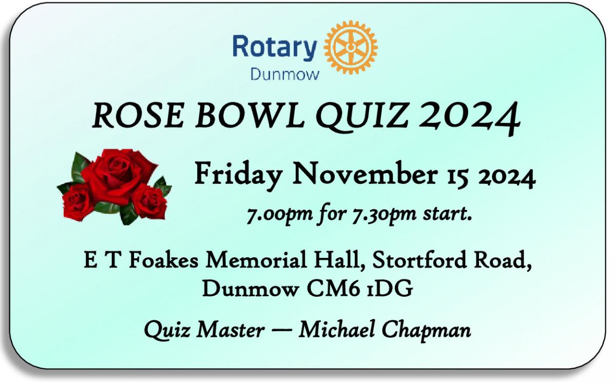 We were far too late in launching our 35th Rose Bowl Quiz back in February, with the result that we had to postpone it because too few teams were available. We’re sorry. In the hope that we can avoid the same error for our re-run, I am pleased to tell you that this year’s Rotary Rose Bowl Quiz will now take place on Friday 15th November — more than six weeks away, so you have loads of time to marshal your troops. The format will be as before: a fiercely fought ten-round contest for teams of up to eight. The winning team will hold the prestigious Rose Bowl Trophy for the ensuing year.
