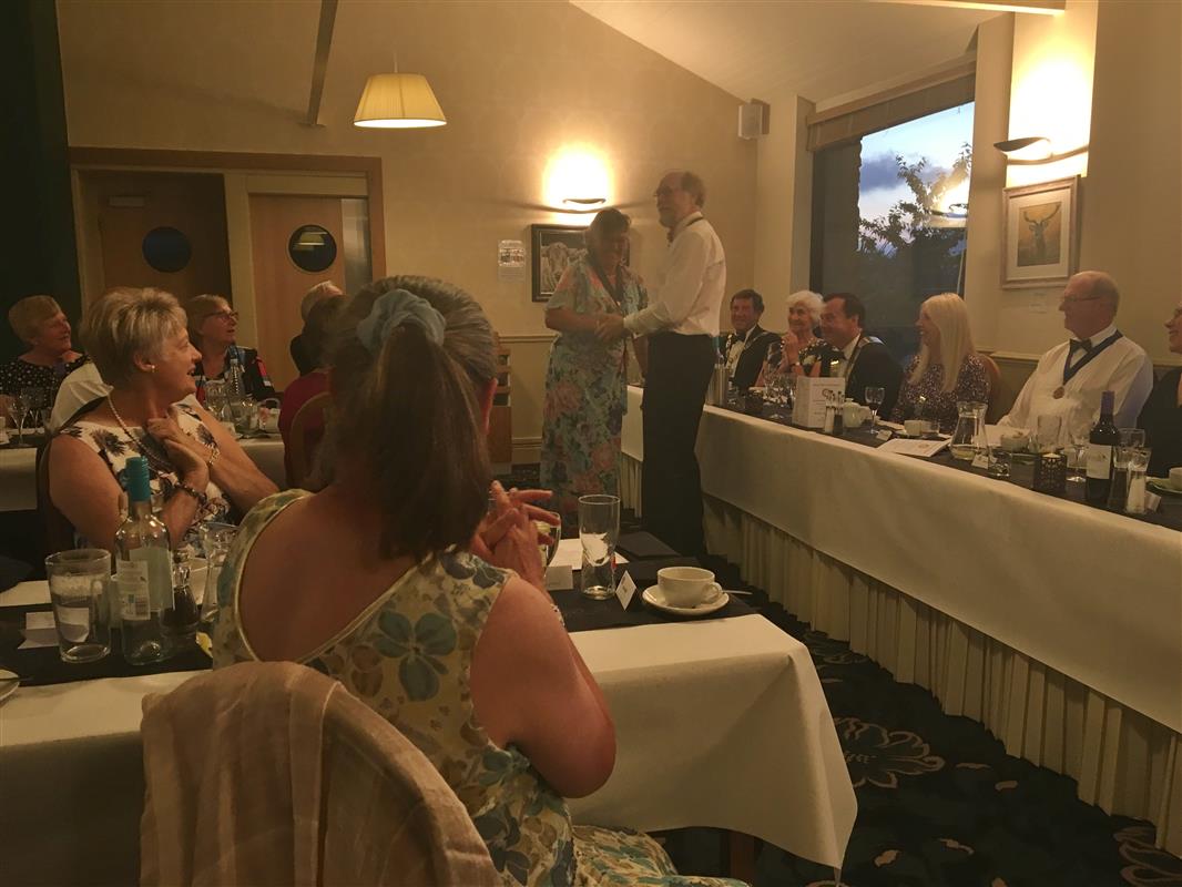 The official "Changing of the guard" then took place, with Howard Binks installing David Spashett as the new President, David passing the President Elect jewel to Susan Rogers, and John Morton passing the Immediate Pst President's jewel to Howard Binks.