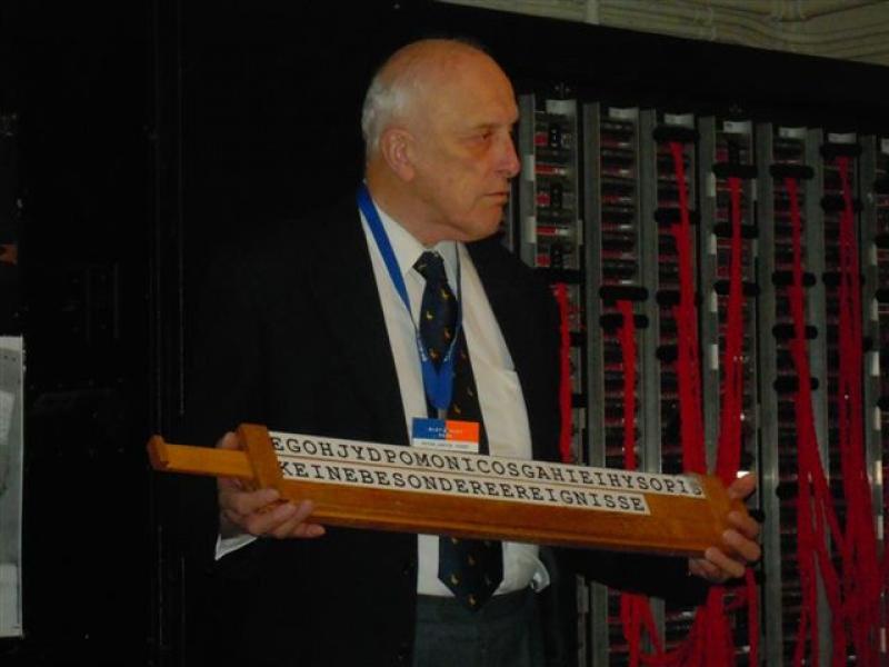 Peter told us that the use of codes went back to the time of Julius Caesar, and brought us though ever more complex cyphers, up to 1939. Most people now are aware of what is known as the Enigma Machine. In effect, a portable typewriter, that could be programmed, and capable of encrypting a message, into any one of several trillion variations, making it, in the eyes of the German Military, secure and unbreakable by the then standards. Every year it was improved. This had been the system since the early 1920