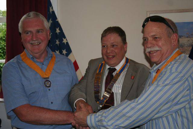 more President Bruce Golson is now in the pilot's seat for the forthcoming Rotary year. His support team includes Stuart Cavanagh and Lynne Turner as his senior and junior VP's respectively. Immediate Past President Alan Chilcott hosted the handover event.
