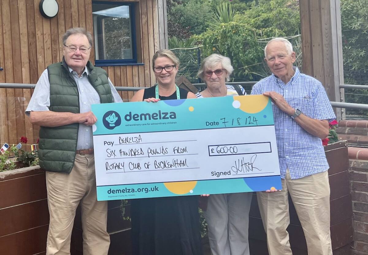 Rotarians Chris Bird and Roger Northam presented our cheque for £600 to Dulcie Newbold at Demelza in Eltham on 22 June 2023.